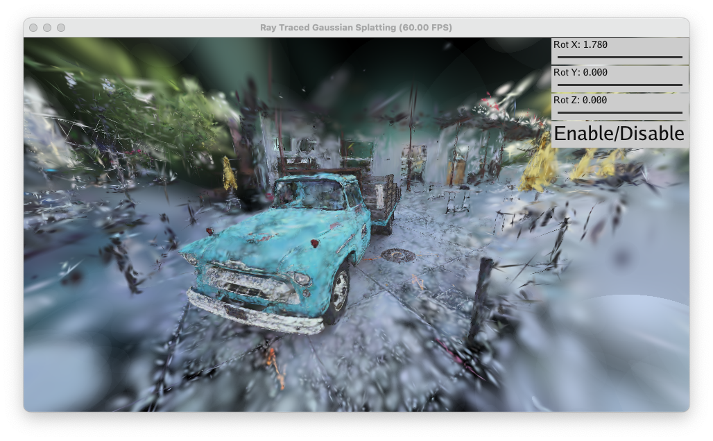 For the example truck scene, when setting the BVH size to 32k, we can build the BVH in 3 minutes and render the scene in roughly 15FPS for most viewing angles far from high density area. When the camera move close to high density area, the frame rate drops to around 5FPS.