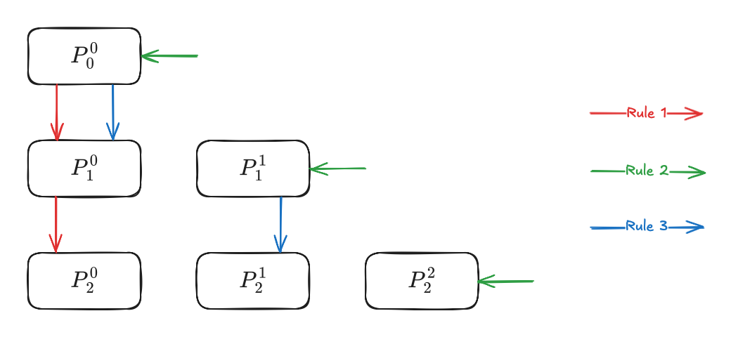 P_{2}^{1} &= x \cdot 3 \cdot P_{1}^{1}, \quad (\text{Rule 3}) \\